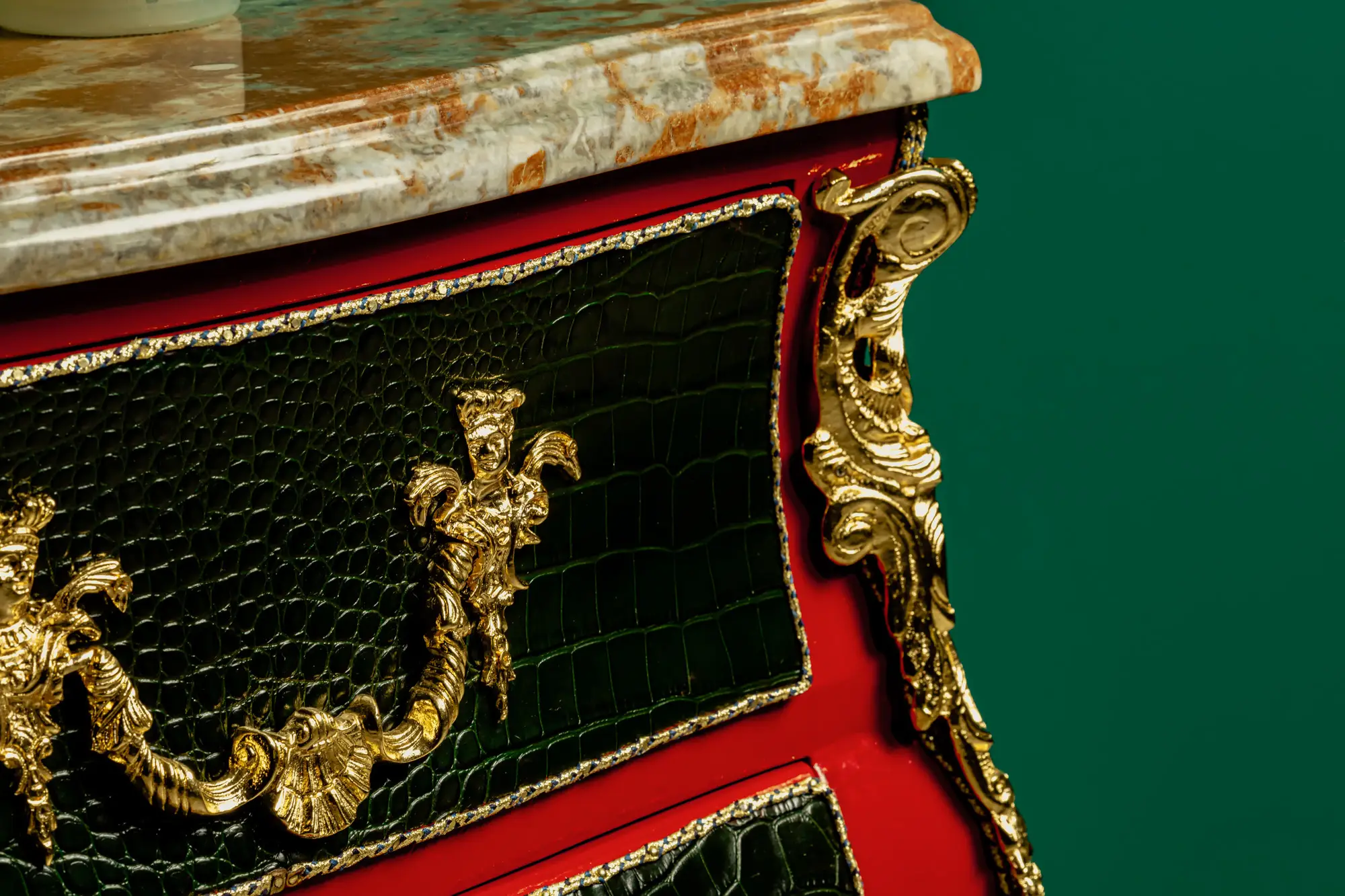 Dettagli e applicazioni dorate in oro 24 carati, lavorati con estrema cura per esaltare l’eleganza barocca del mobile.