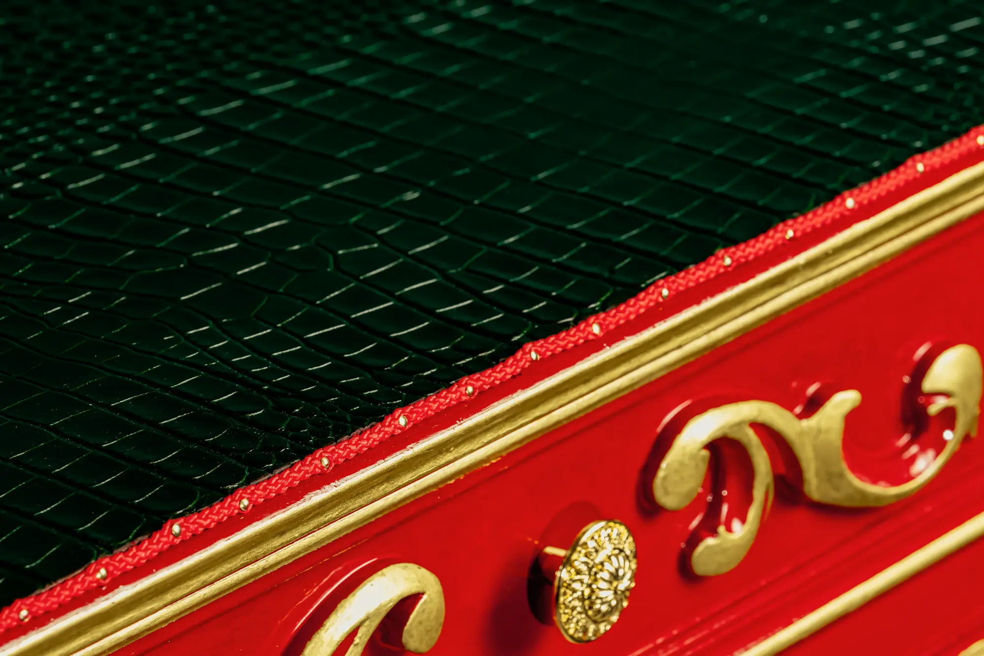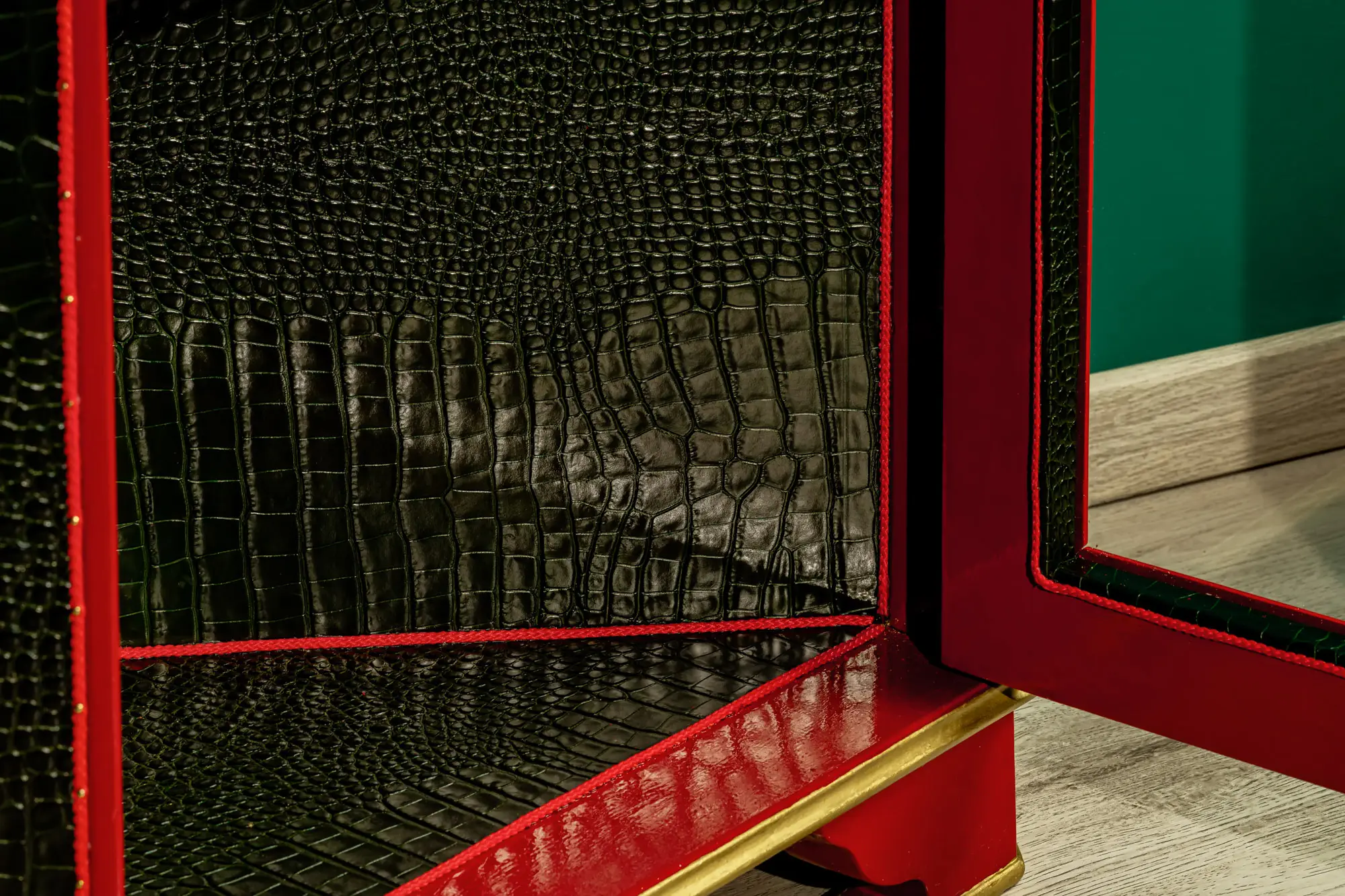 Rivestimento in vera pelle di coccodrillo, selezionata e applicata artigianalmente per creare una texture profonda e sofisticata.