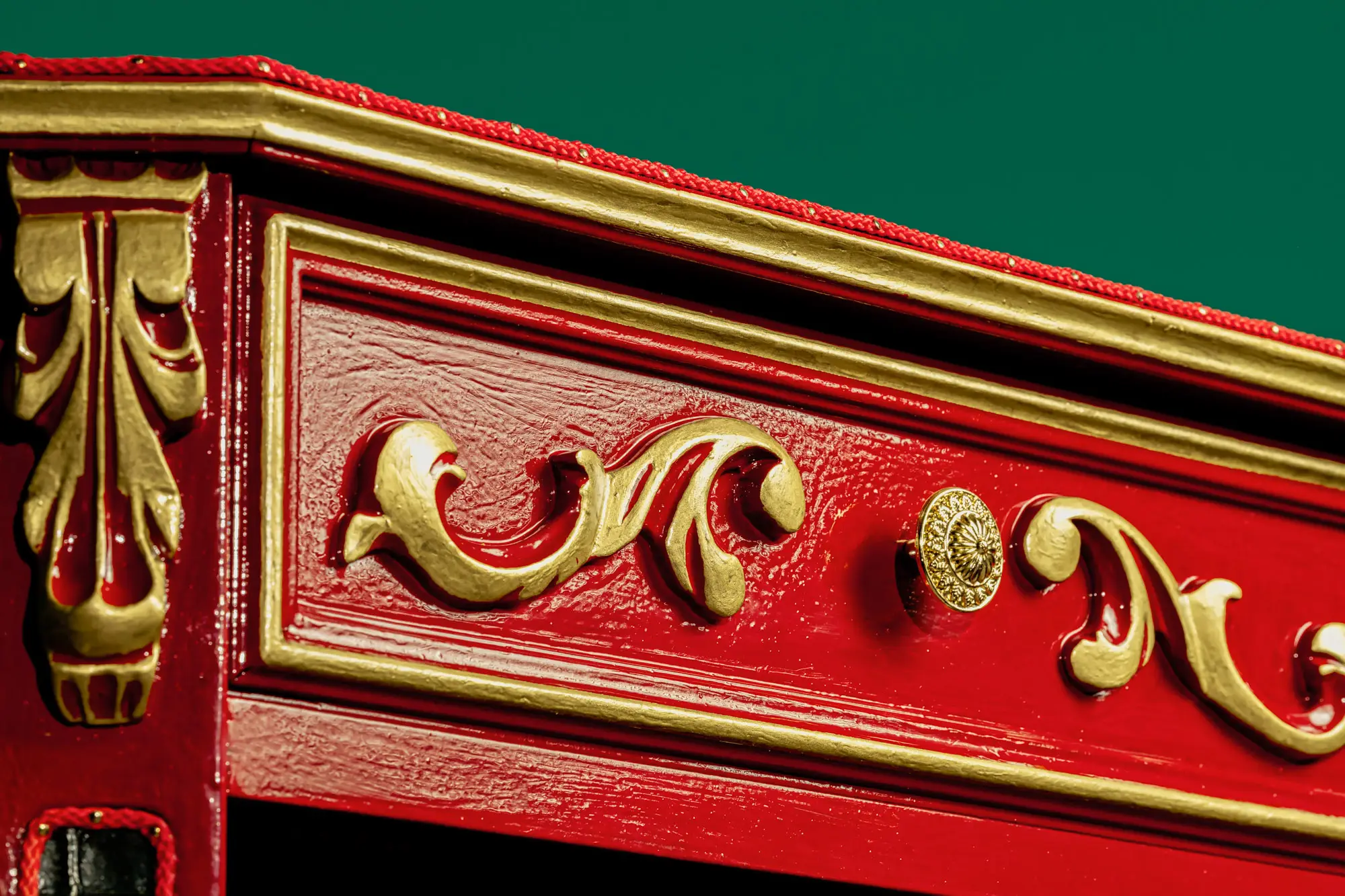 Decorazioni dorate in oro 24 carati, modellate a rilievo con motivi floreali e volute barocche che donano un’eleganza regale.