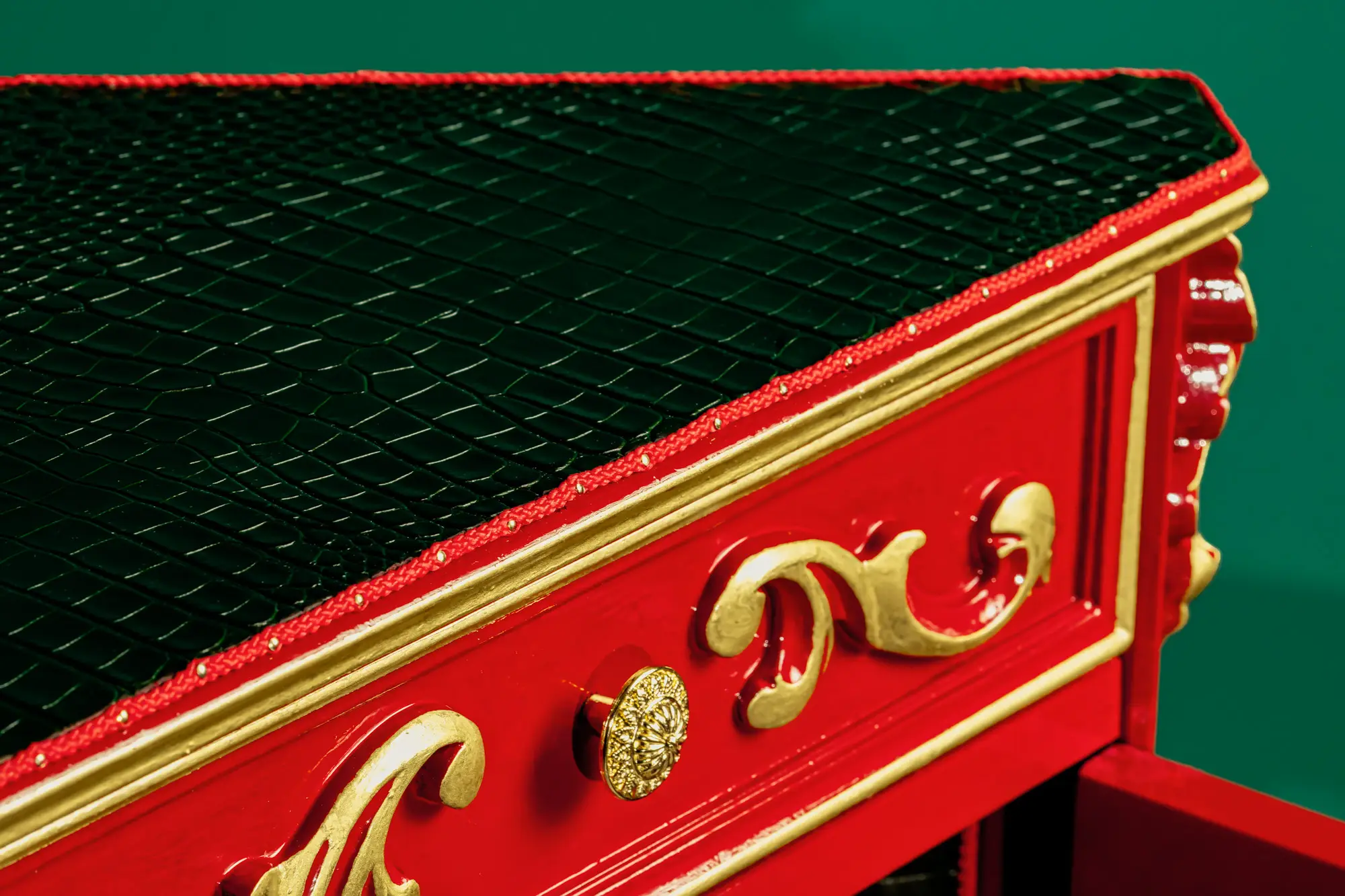 Struttura in legno massello, dipinta con una laccatura rossa lucida che crea un contrasto scenografico con l’interno scuro in pelle.