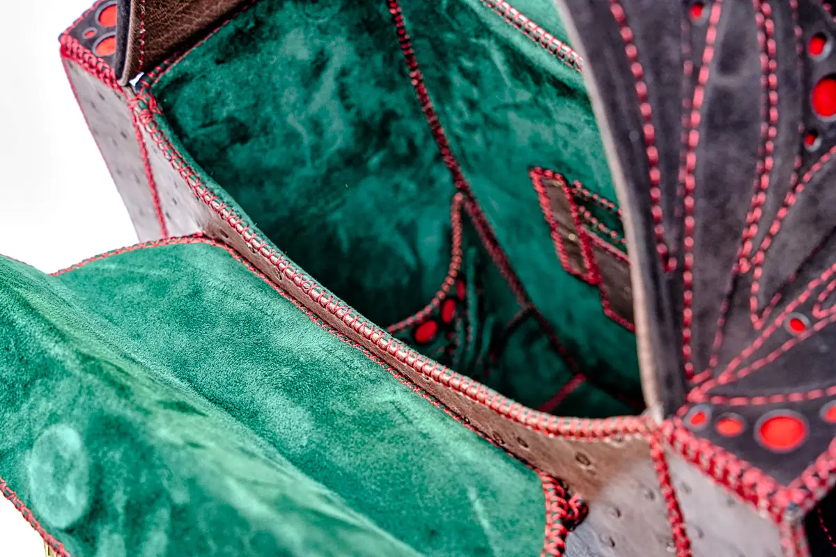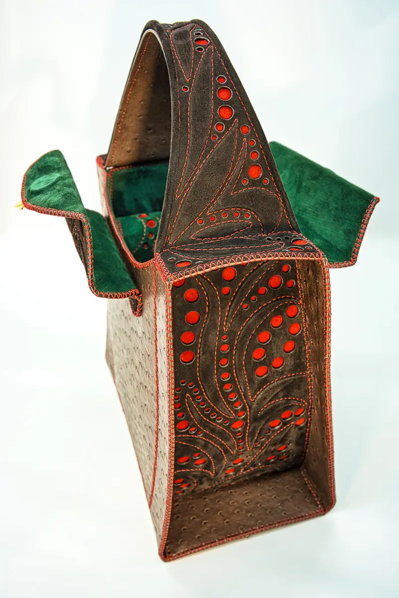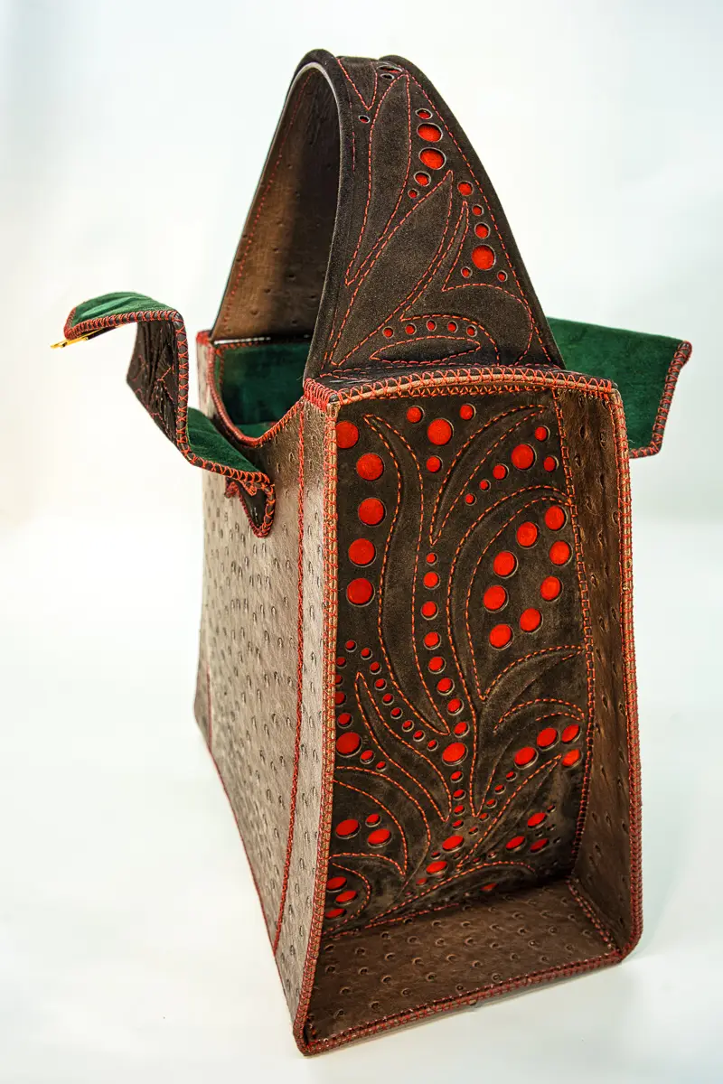 | Tecnica e materiali | struzzo, capra scamosciata, Interamente realizzata a mano con applicazioni in rilievo |