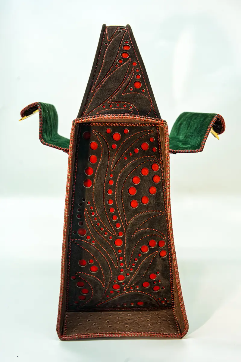 Gli accessori in ottone, dorati in oro 24 carati, sono creati da mani esperte con oltre 50 anni di esperienza. Le forme delle borse e degli accessori sono vere e proprie opere d’arte, nate nel laboratorio Natii Art Collection.