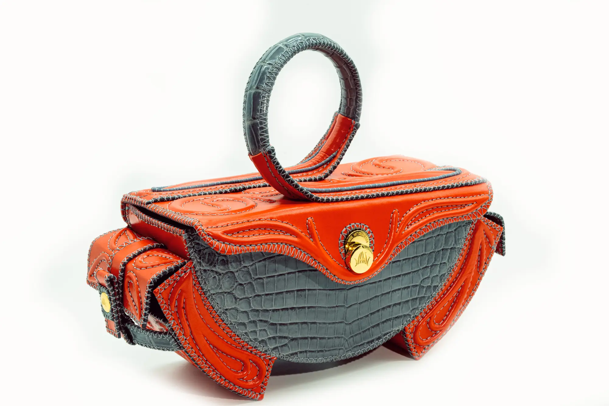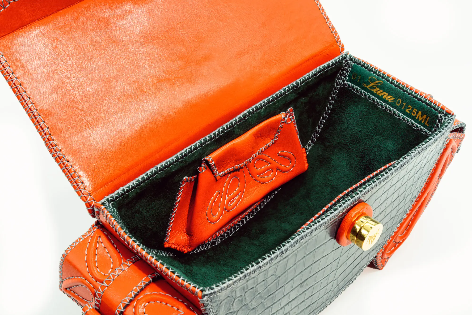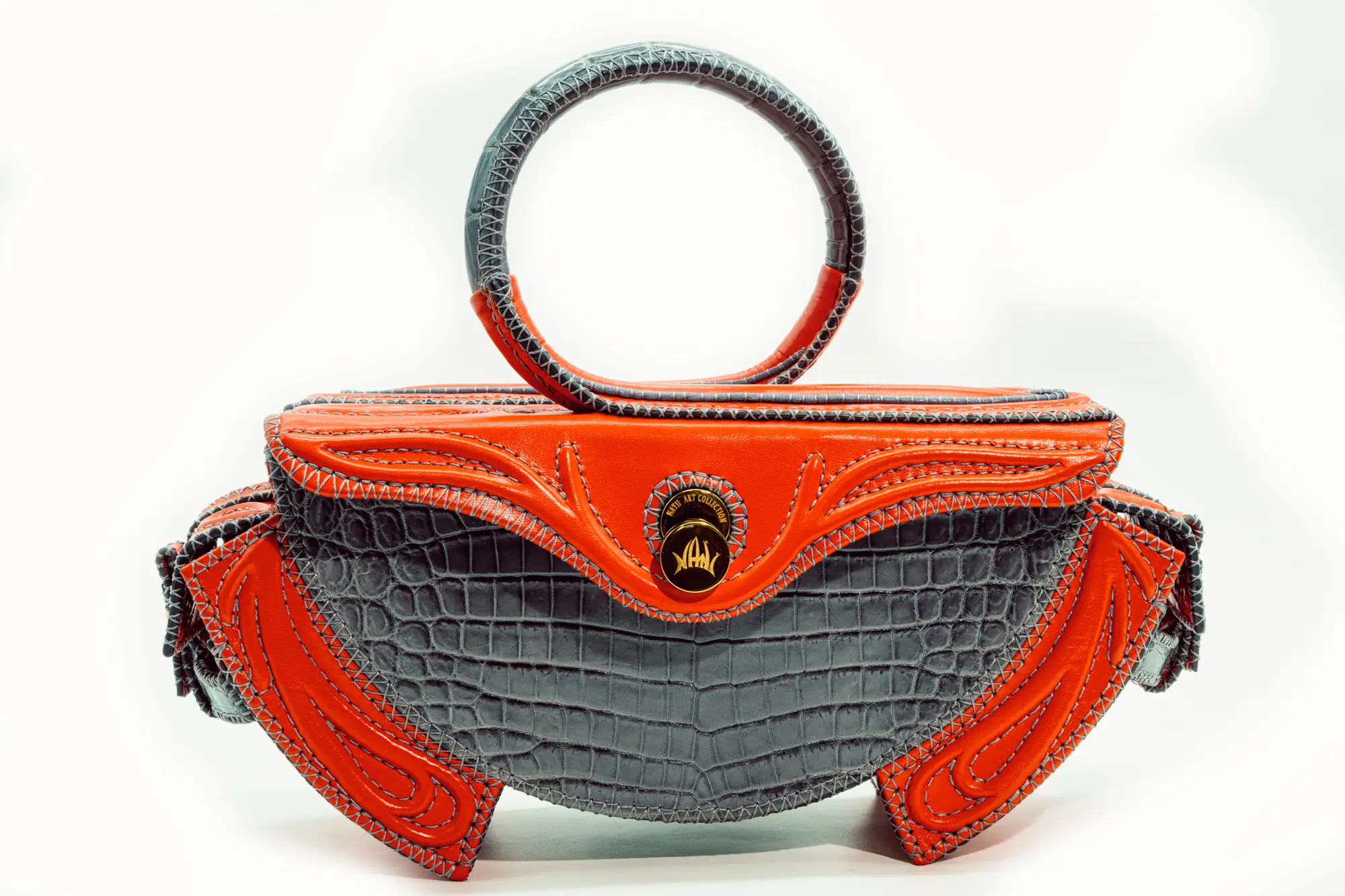 All’esterno, il contrasto magnetico tra la pelle di coccodrillo grigia e l’agnello lucido arancio crea un dialogo di forza e passione, di equilibrio e audacia. Le linee sinuose sembrano scolpite dal vento, mentre le finiture dorate 24 kt accendono riflessi di sole, simbolo di luce interiore e potere personale.