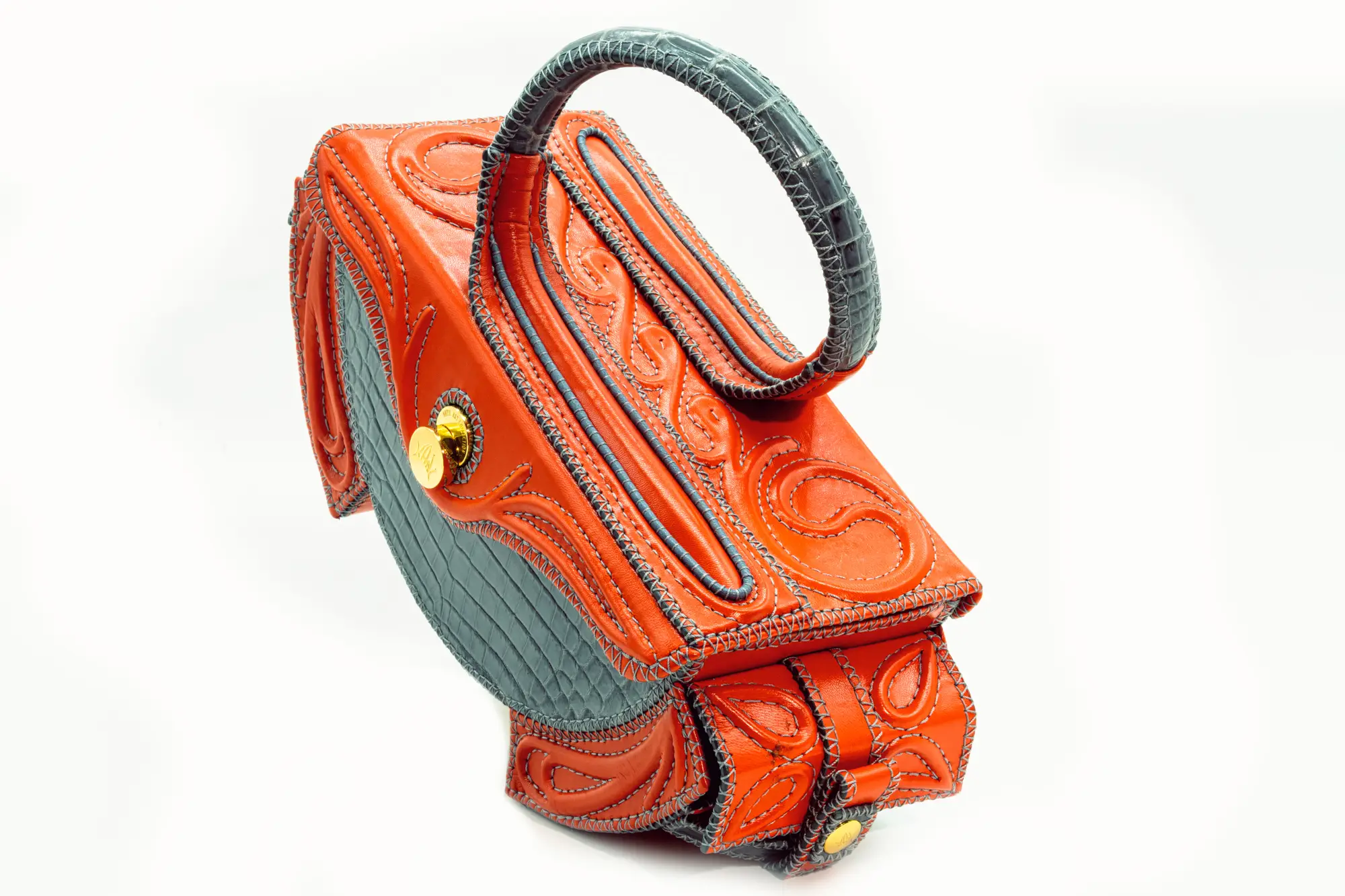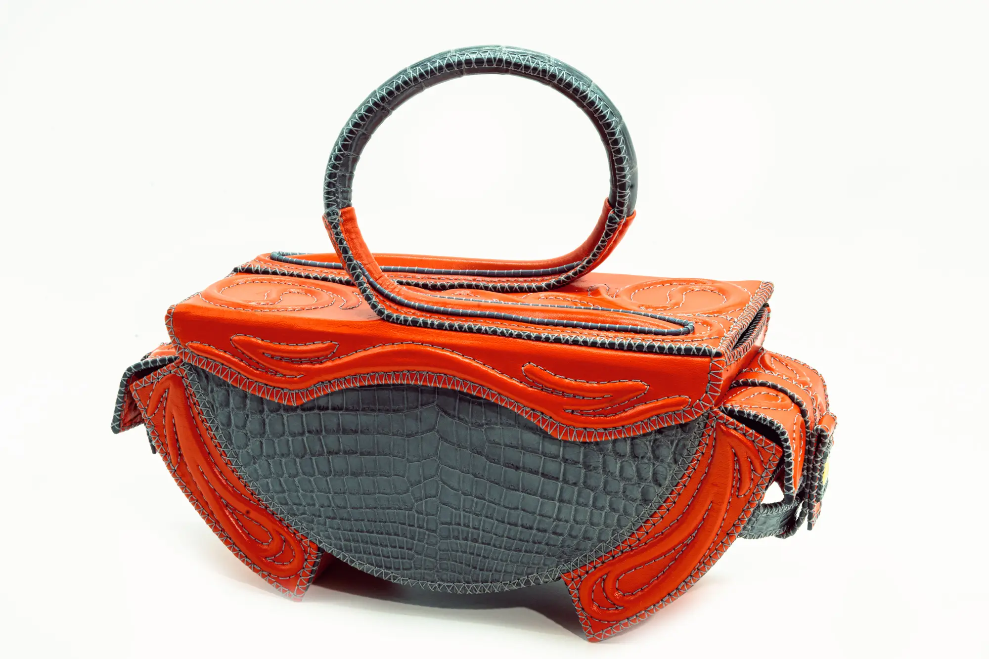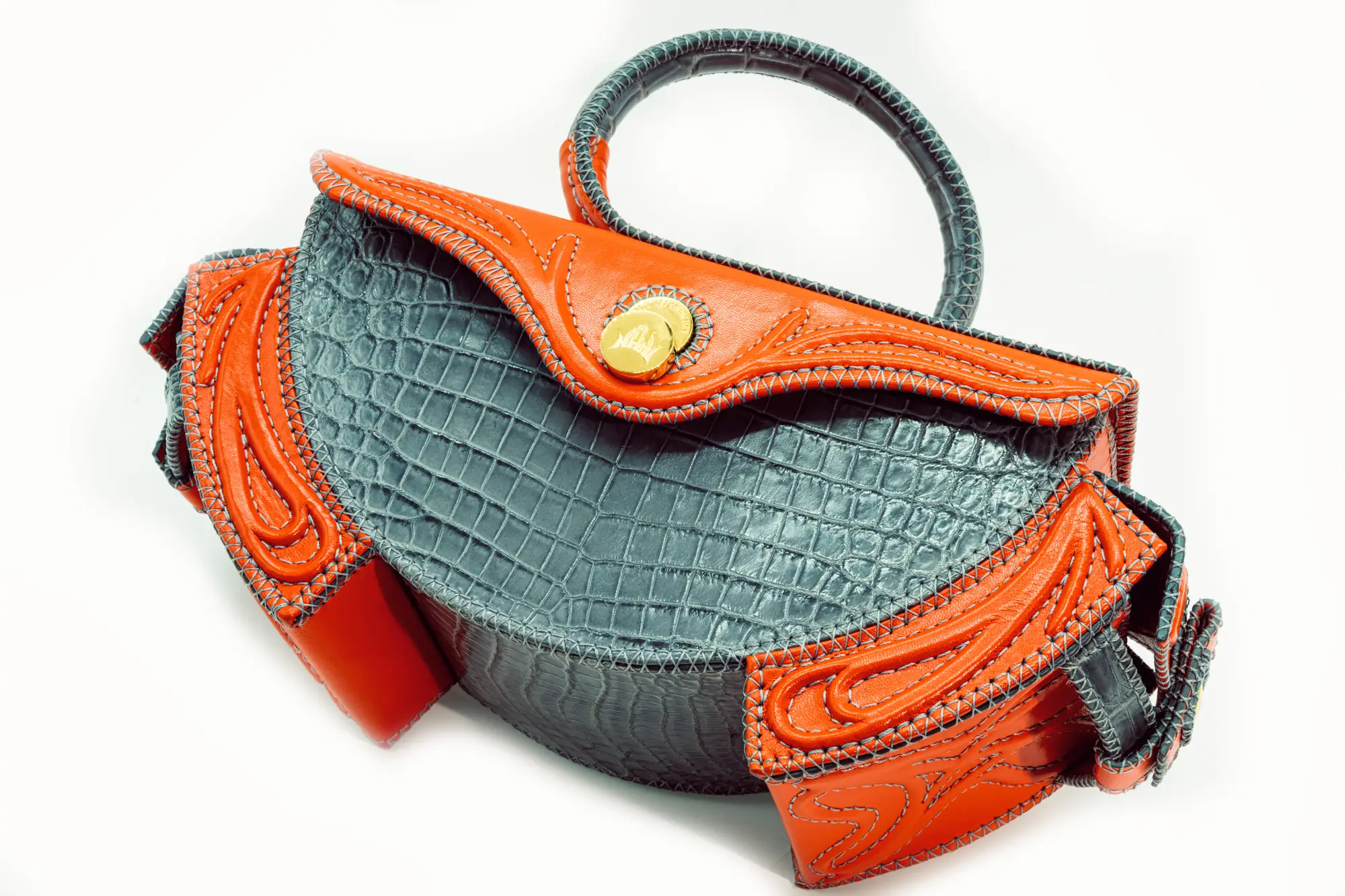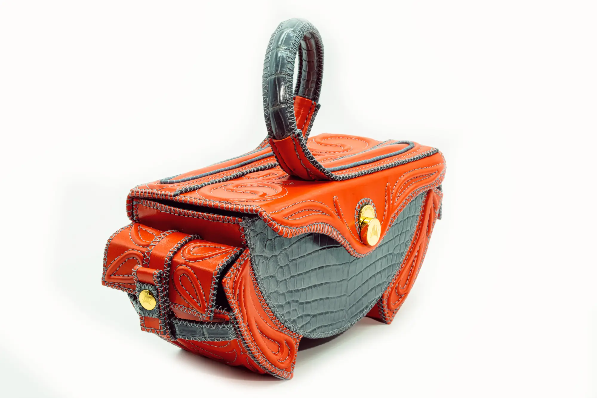 All’esterno, il contrasto magnetico tra la pelle di coccodrillo grigia e l’agnello lucido arancio crea un dialogo di forza e passione, di equilibrio e audacia. Le linee sinuose sembrano scolpite dal vento, mentre le finiture dorate 24 kt accendono riflessi di sole, simbolo di luce interiore e potere personale.
