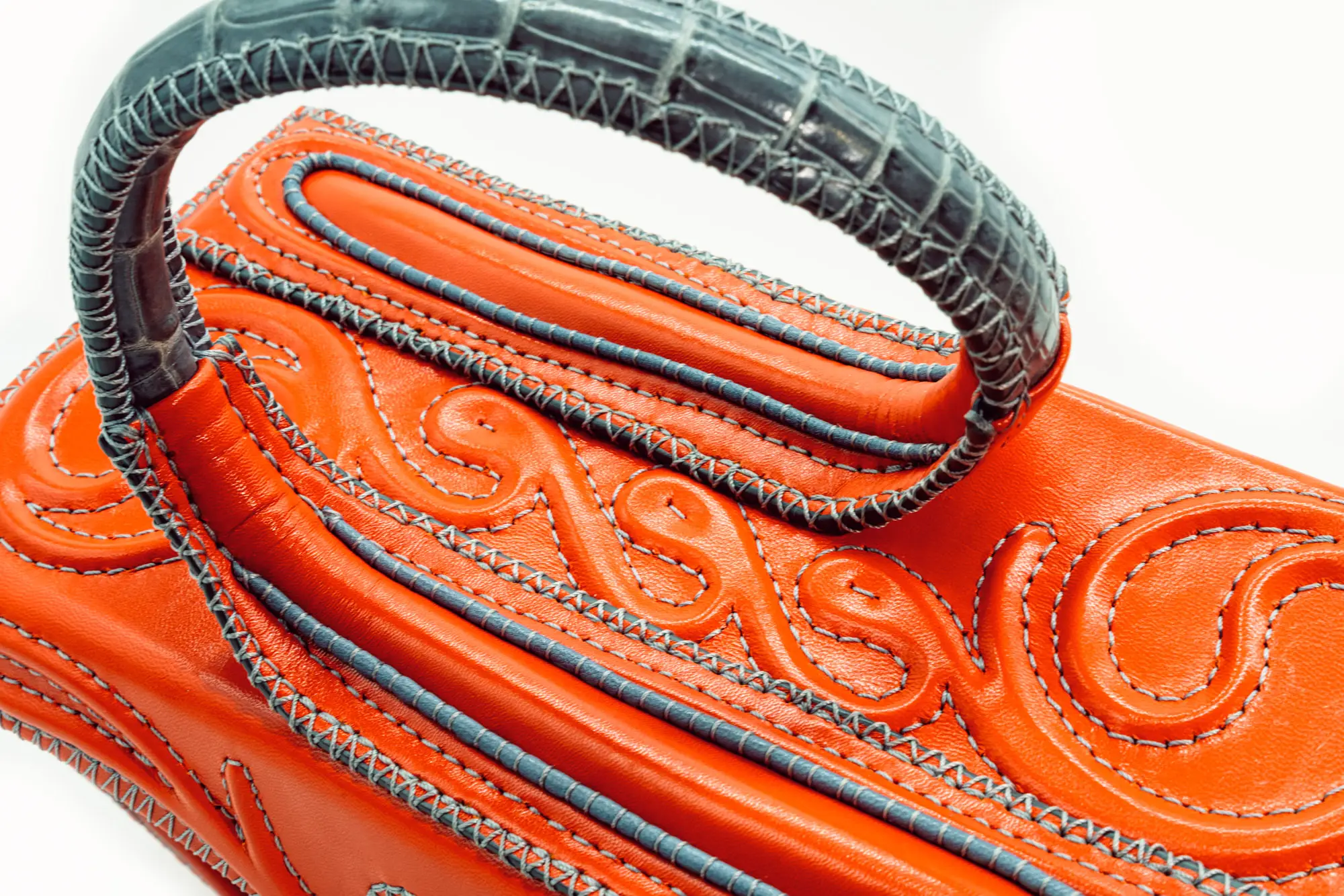 Ogni curva, ogni punto di cucitura è il risultato di ore di maestria artigianale, dove mani esperte hanno intrecciato tecnica e poesia. L’interno, interamente realizzato a mano, avvolge in una morbida carezza di pelle d’agnello lucido color arancio, arricchita da rilievi scolpiti a mano che raccontano una danza di luce e movimento. Una tasca interna e un portacarte finemente decorati custodiscono il lusso silenzioso della precisione.