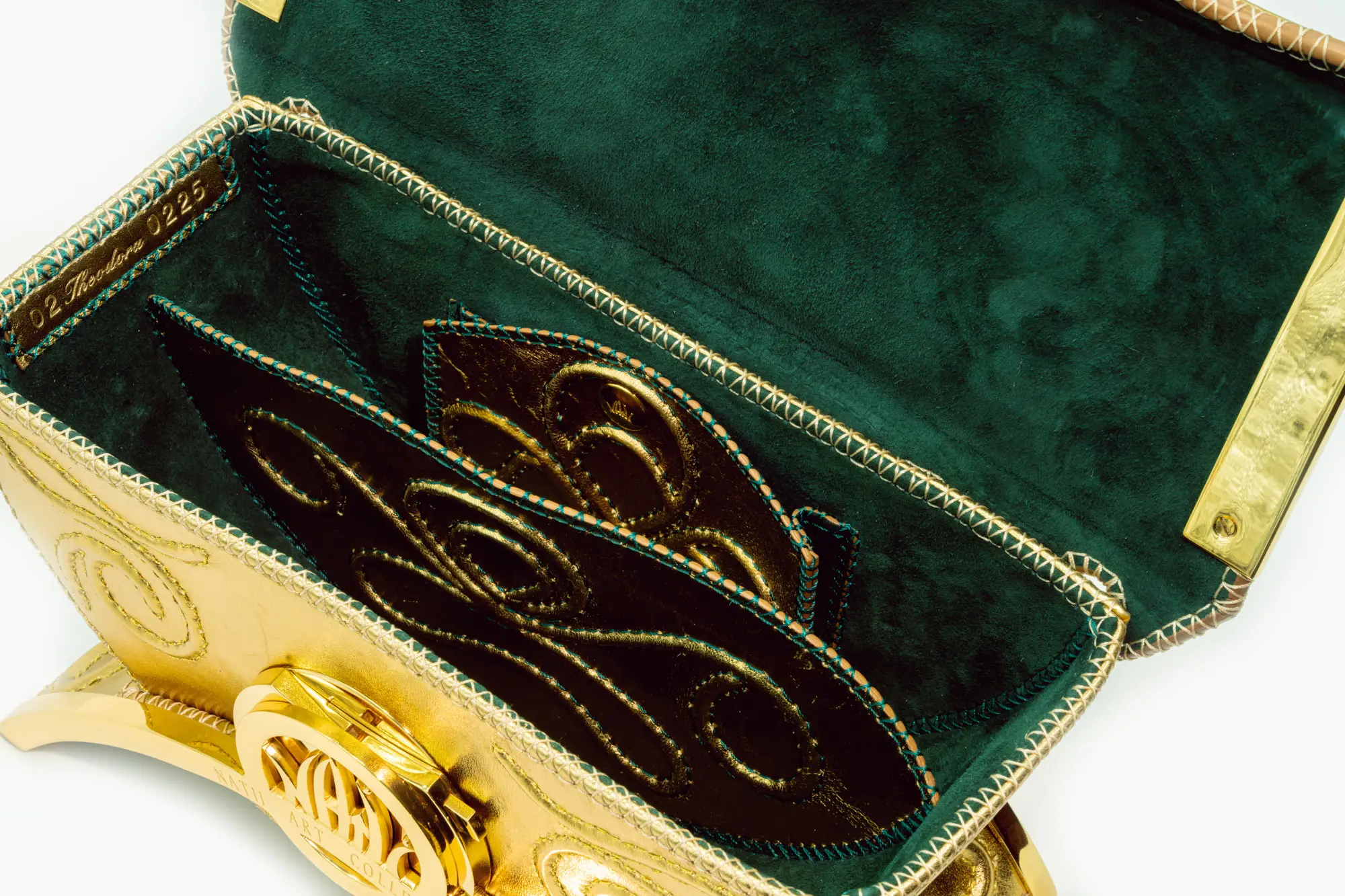 | Tecnica e materiali | Internamente realizzato con applicazioni in rilievo cuciti a mano,foderata con pelle verde capra scamosciata,con divisorio,porta carte e tasca. Esternernamente realizzato con applicazioni in rilievo cuciti a mano,pelle di agnello silk chic,colore oro. |