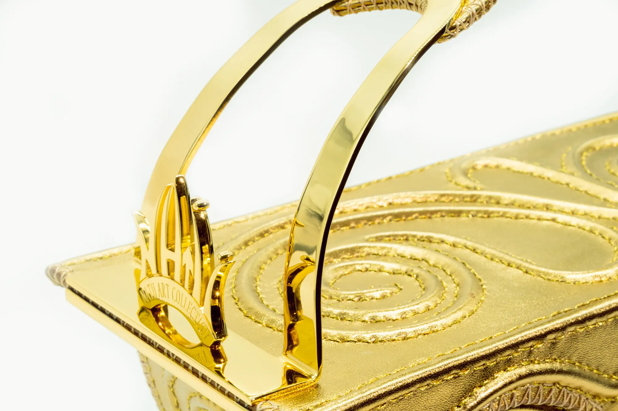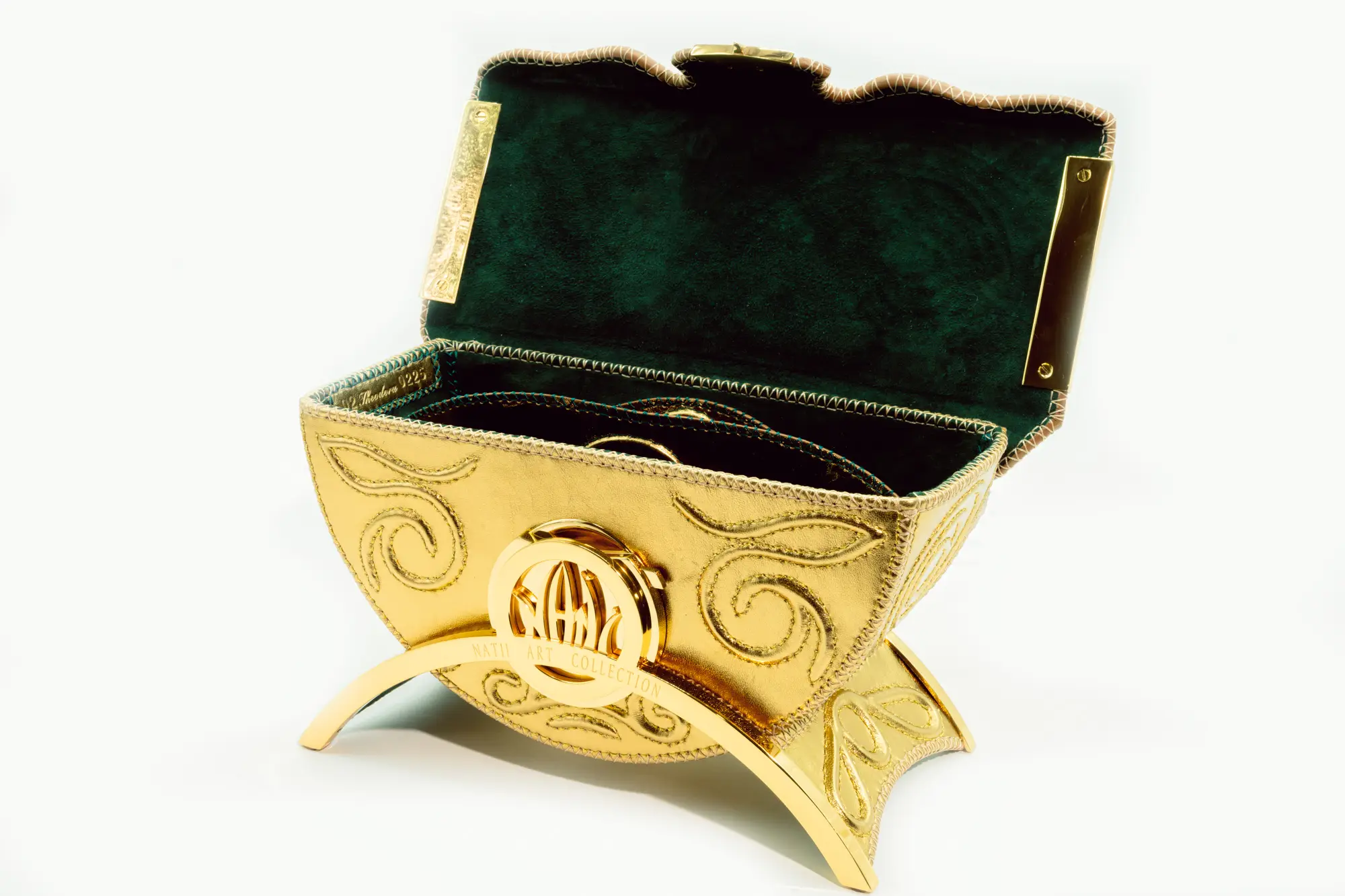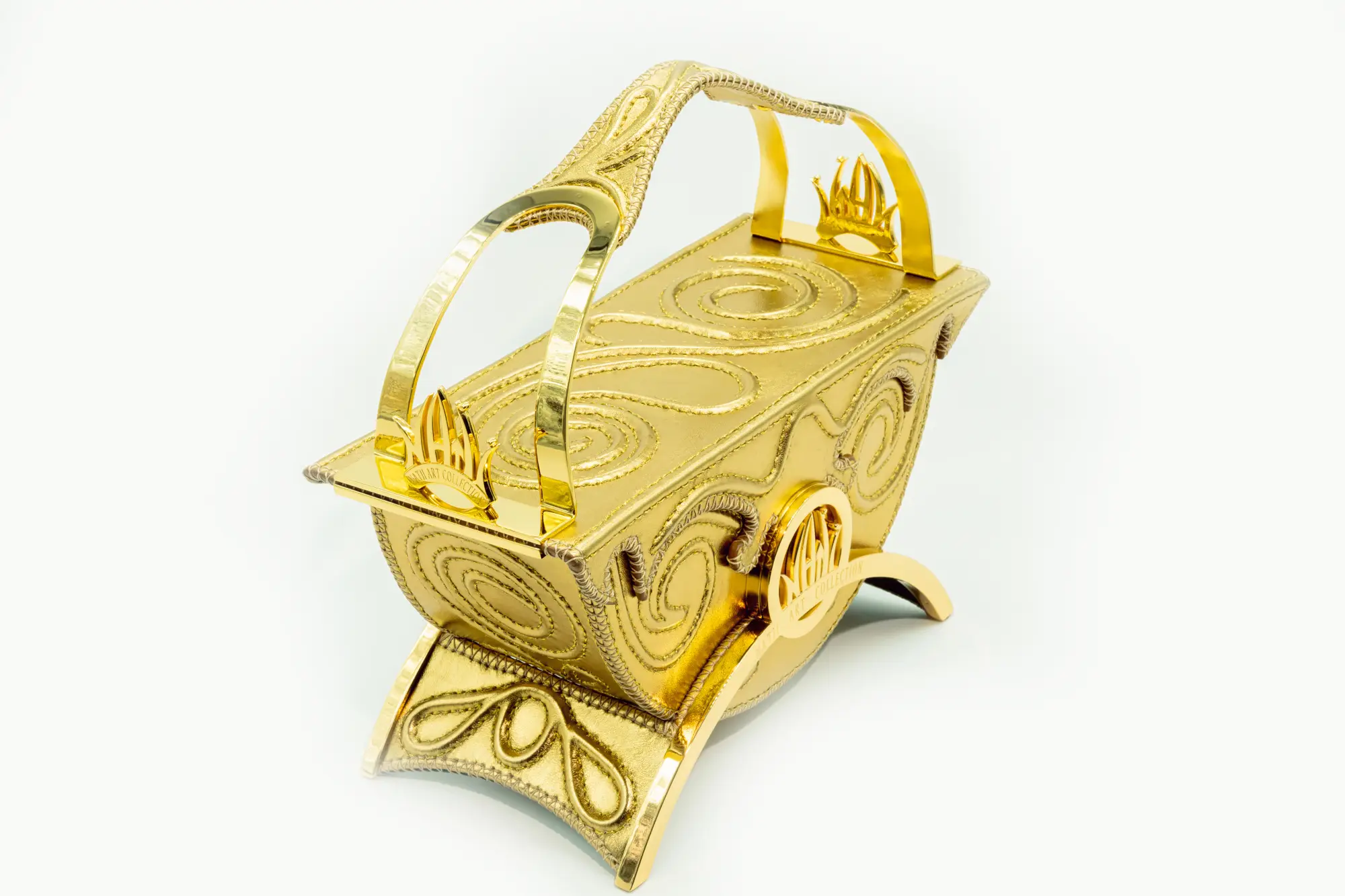 Teodora 020225 non è una semplice borsa: è un trono in miniatura, un simbolo di regalità contemporanea. Realizzata interamente a mano in Italia, unisce il fascino dell’oro lucente con un design scultoreo che omaggia l’arte bizantina e l’eterno femminile.