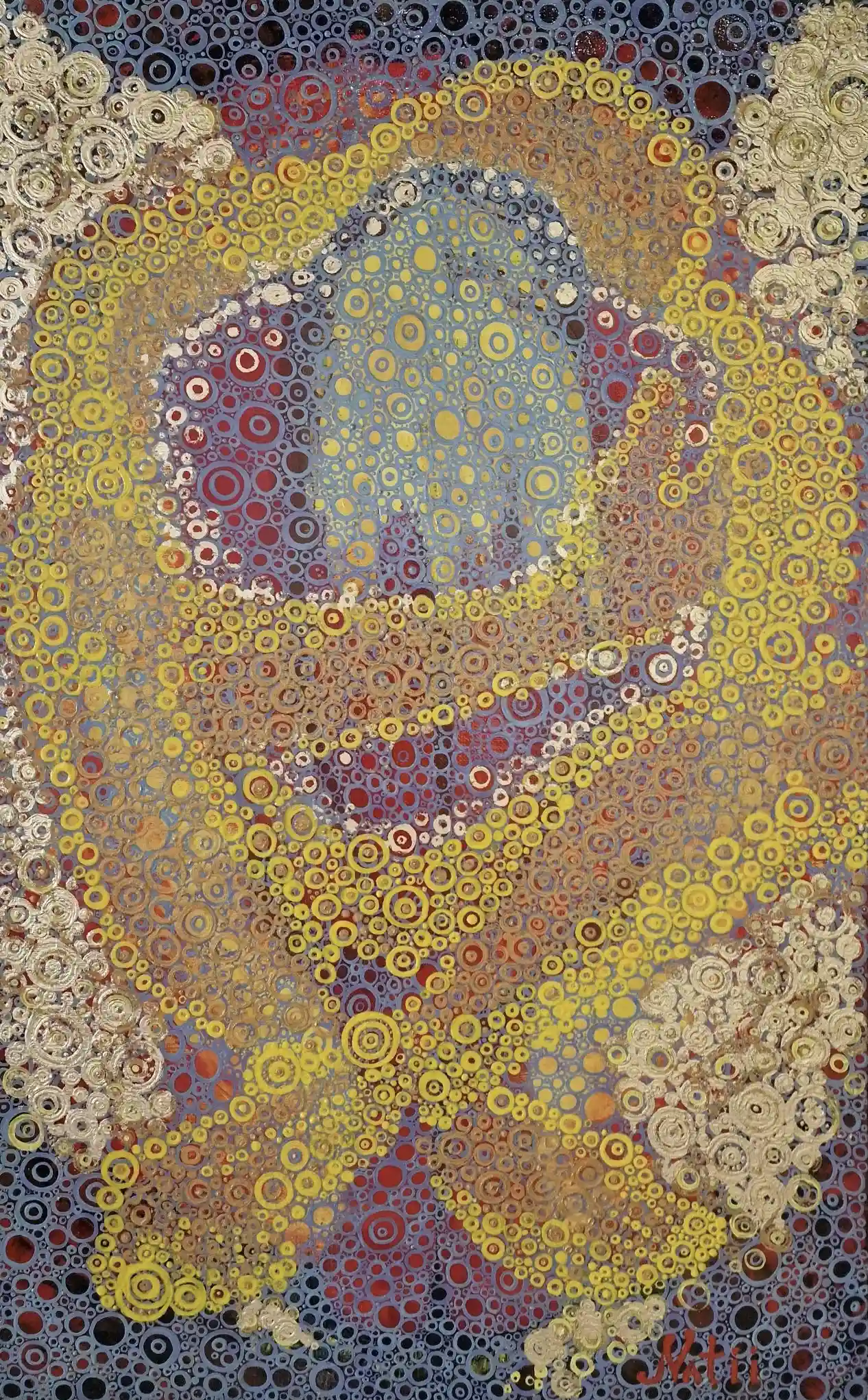Olio su tela – canapa ,ogni cerchio fatto a mano realizzato con pennello, foglia oro .